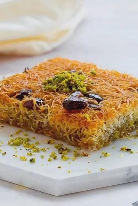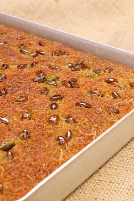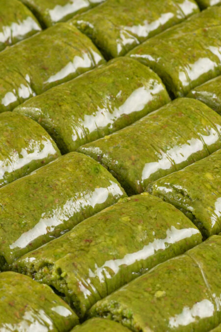 Sweet flaky pastry that’s a traditional dessert In the Mediterranean and middle east. Inside is pistachio. 36 slices, 3.3 pounds. It came from Turkey by airplane overnight.